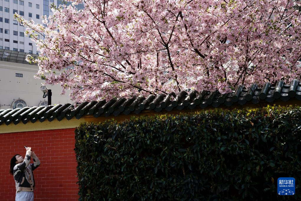 3月20日,一名市民在上海交通大学墙外拍摄樱花。新华社记者 张建松 摄