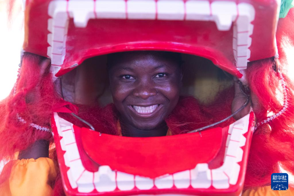 1月19日,在赞比亚首都卢萨卡举行的春节庙会活动上,一名赞比亚武术协会成员准备表演舞狮。