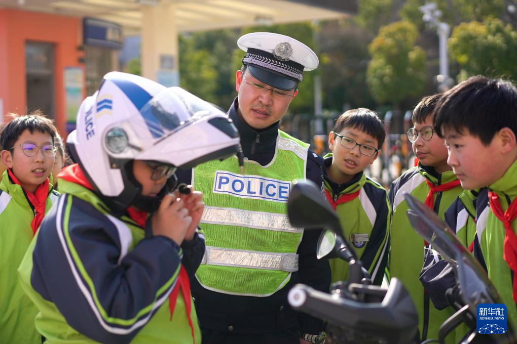 2月13日,浙江省岱山县公安局交通警察大队辅警在辖区高亭小学向学生讲解如何正确佩戴安全头盔。新华社发(邹训永摄)