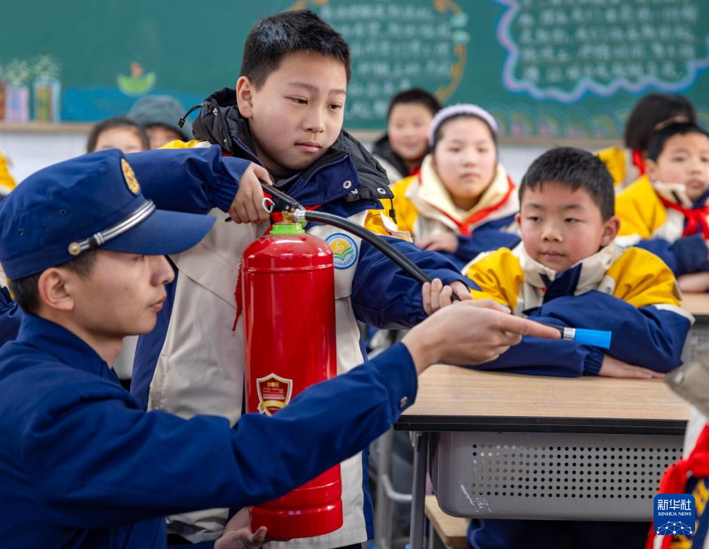 2月13日,消防员在江苏省泰州市海陵区九龙实验学校给学生介绍灭火器安全使用方法。新华社发(汤德宏摄)