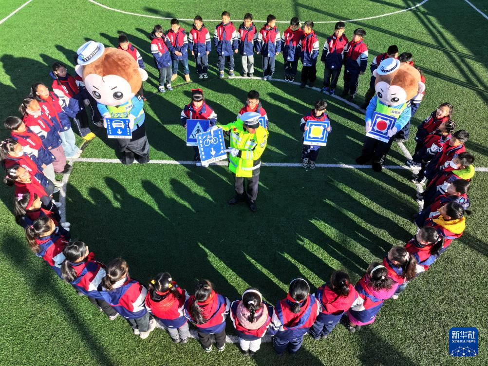 2月13日,在江苏省连云港市院前小学,交警为学生讲解交通安全知识(无人机照片)。新华社发(王春摄)