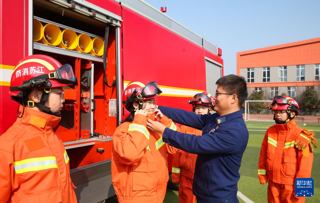 2月13日,在江苏省句容市葛村中心小学,学生在消防员的帮助下体验穿戴消防救援服。新华社发(钟学满摄)