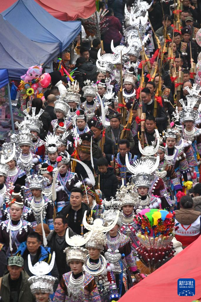 苗族姑娘在柳州市融水苗族自治县杆洞乡百鸟衣芦笙坡会上进行民俗展演(2月5日摄)。