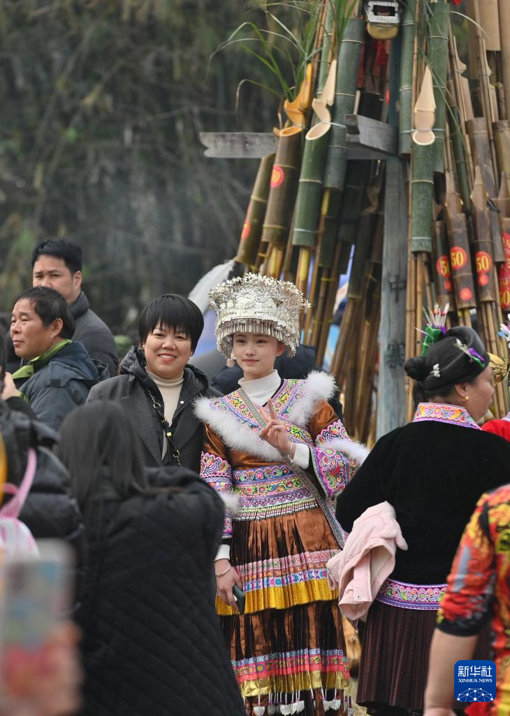 在柳州市融水苗族自治县香粉乡十六古龙坡会上,游客和苗族姑娘合影(2月13日摄)。新华社记者 黄孝邦 摄