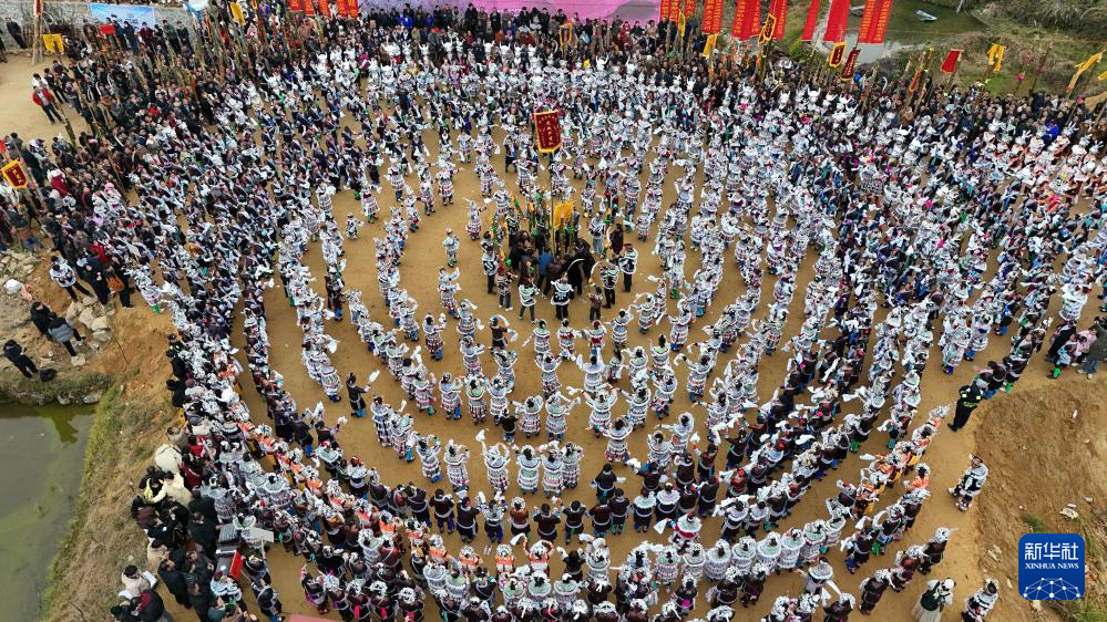 在柳州市融水苗族自治县杆洞乡百鸟衣芦笙坡会上,人们跳芦笙踩堂舞(无人机照片,2月5日摄)。新华社发(欧明熙 摄)