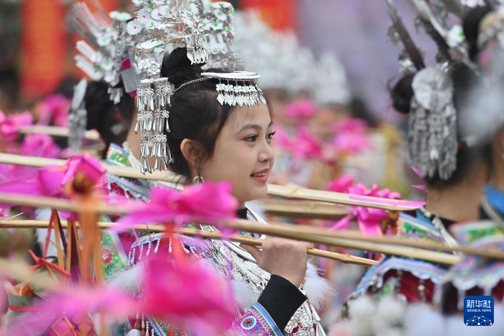 在柳州市融水苗族自治县杆洞乡百鸟衣芦笙坡会,苗族姑娘进行民俗展演(2月5日摄)。新华社记者 黄孝邦 摄