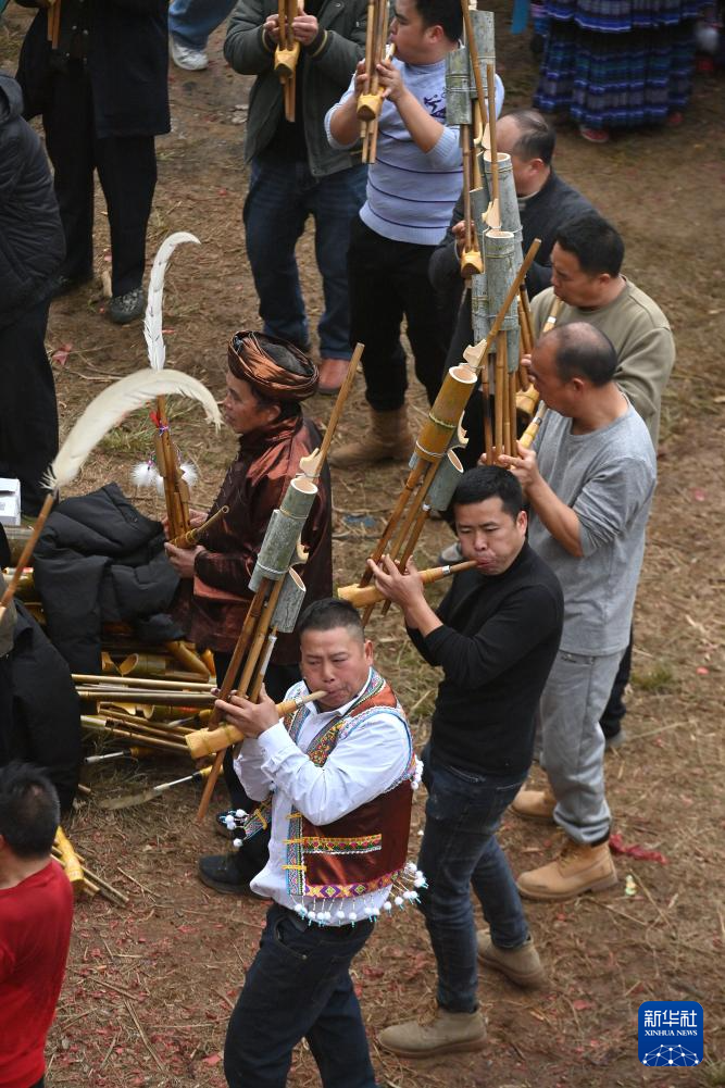 在柳州市融水苗族自治县香粉乡十六古龙坡会上,村民在吹芦笙(2月13日摄)。新华社记者 黄孝邦 摄