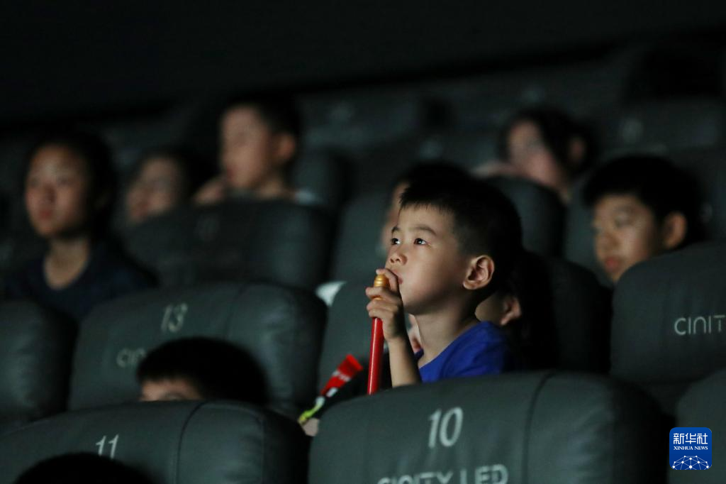 8月17日,小朋友在浙江省嘉兴市南湖区一家影城等候观影。