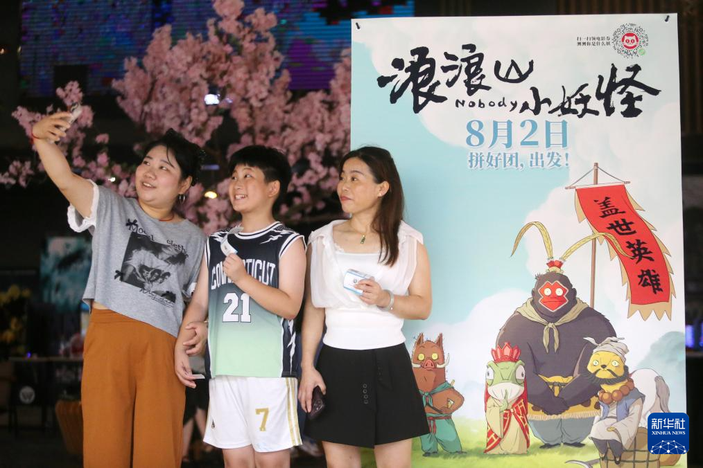 8月17日,观众在江苏省泰州市万象影城动画电影《浪浪山小妖怪》海报前拍照留念。
