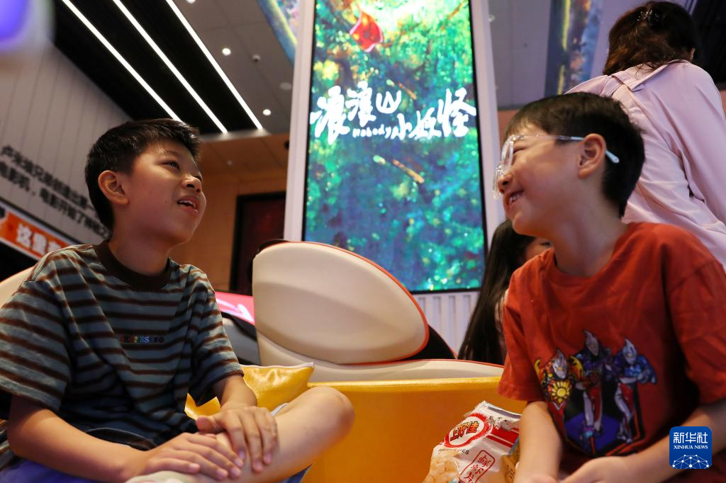 8月17日,小朋友手持“金箍棒”在浙江省嘉兴市南湖区一家影城观看电影《浪浪山小妖怪》。