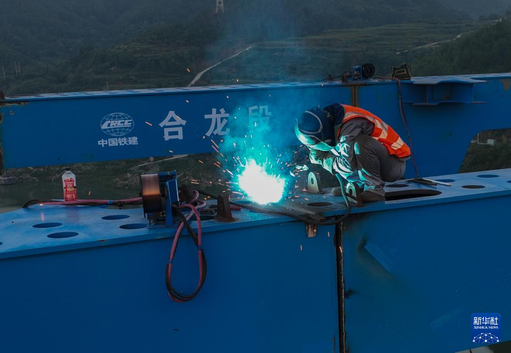 8月18日,工人在进行钢桁梁合龙焊接施工(无人机照片)。