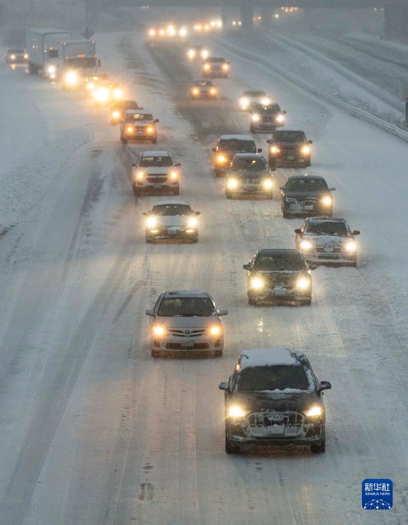 1月25日,在加拿大大多伦多地区米西索加,车辆在积雪的公路上行驶。
