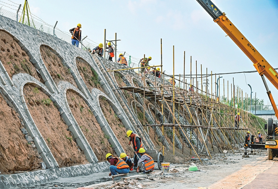 7月16日,長治市潞州區東外環東關橋段,施工人員正加固道路兩側護坡,最大限度消除汛期可能引發的安全隱患。司敏攝