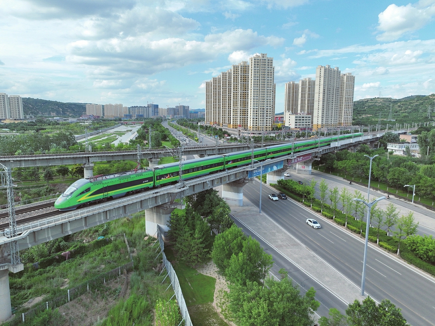 7月23日,“綠巨人”復興號動車行駛在呂梁市區段鐵路橋,正奔赴呂梁站。現代交通動脈與城市建筑、綠樹碧水交織,勾勒出城市活力新圖景。