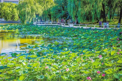 近日,大同公園西湖片區的荷花競相綻放,為我市夏日增添一抹清新亮色。據悉,該區域去年栽種了1300多平方米荷花,旨在豐富四季園林景觀,優化公園生態環境。如今,粉嫩的荷花點綴於綠葉間,隨風搖曳,吸引眾多市民駐足觀賞、拍照留念。圖為市民在公園內賞花拍照。