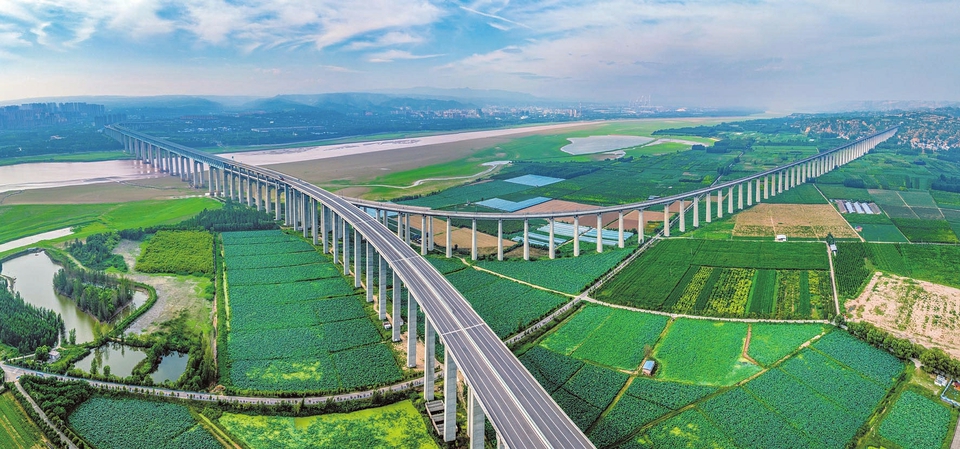 七月二十五日,平陸縣張村鎮黃河段一側,綠油油的荷塘荷葉、黃河一號旅游公路、氣勢如虹的黃河大橋與奔騰不息的黃河交相輝映,美不勝收。