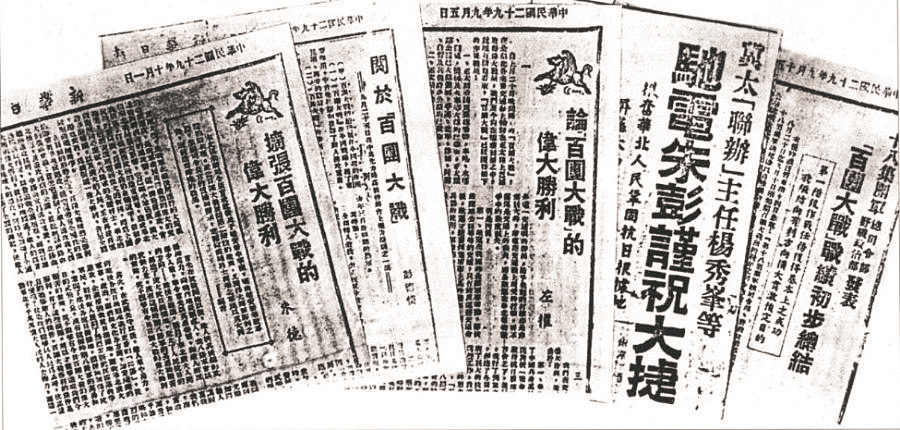 百團大戰勝利后,《新華日報》刊載彭德懷《關於百團大戰》一文,指出:由於百團大戰的勝利興奮了全國軍民,因此我國抗戰的力量也必能更加生長,更加發展,更加堅決起來,更加便利於我們去克服當前的抗戰困難。……百團大戰的勝利,乃是華北敵后三年來力求進步的結果,沒有各個抗日根據地軍事政治經濟民運各方面的進步,這個勝利是不可能的,因此百團大戰向全國同胞昭示著這樣一個真理:力求進步乃是爭取勝利的正確道路。在百團大戰勝利的影響下,將更加推動全國的進步,這是無可懷疑的。圖為朱德、彭德懷、左權等著文介紹百團大戰的戰績和基本經驗。