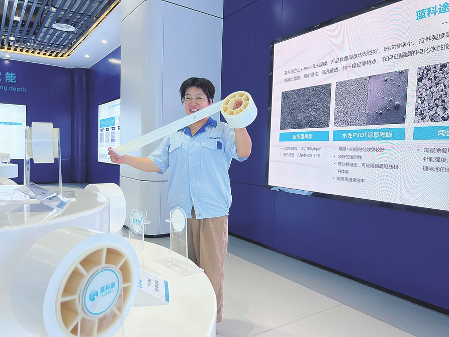 山西藍科途新材料科技有限公司工作人員正在介紹鋰電池隔膜。本報記者楊永生攝