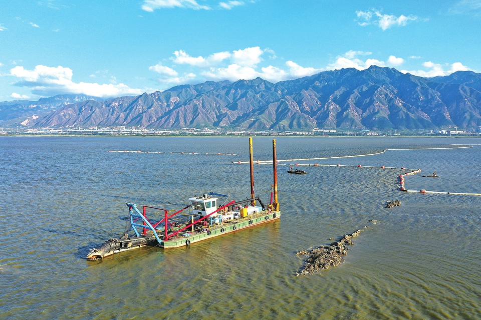 7月28日,永濟市伍姓湖水生態修復工程現場,清淤船正進行湖水清淤作業。近年來,該市不斷加大水資源保護力度,加快水生態修復步伐,打造“水清、岸綠、景美”的生態環境。