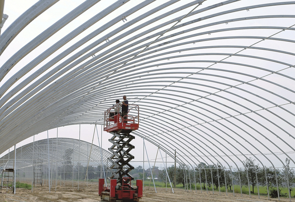 8月3日,萬榮縣解店鎮張戶坡村,工人正在搭建設施大棚。今年以來,解店鎮加大現代農業基礎設施配套建設力度,讓更多農戶投入現代種植業生產,助力農業增效、農民增收。