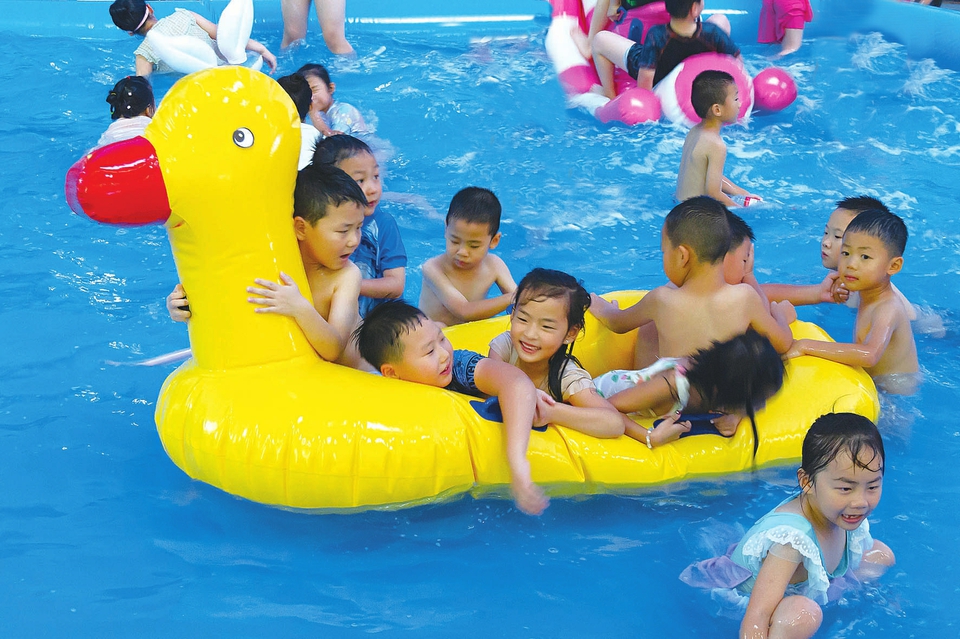 8月2日晚,運城市鹽湖區街頭,孩子們正在移動避暑池內嬉戲。進入暑期以來,當地部分繁華街道上陸續設置了移動避暑池,豐富了市民的夜生活。