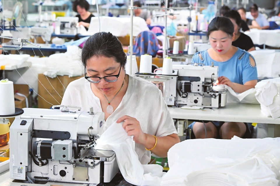 8月11日,位於垣曲縣的山西舜天服飾有限公司生產車間內,工人正在加工夏裝。近年來,該企業注重服裝工藝創新,生產的各種新穎服飾暢銷國內外市場。