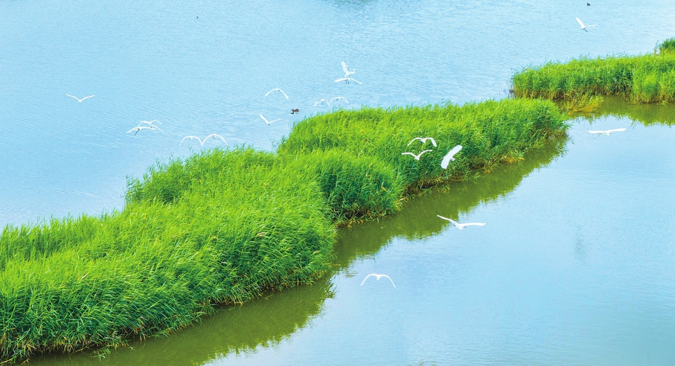 8月16日,運城市鹽湖生態濕地水豐草盛,湖面碧波蕩漾,成群的鳥時而飛翔、時而覓食,成為一道亮麗的風景線。近年來,當地不斷加強生態環境保護,濕地生物多樣性顯著提升,吸引眾多鳥類前來棲息。