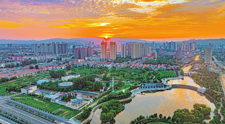 8月20日,長治市潞州區,朝霞與城市公園、道路、民居交相輝映,美不勝收。近年來,該市通過雨污分流改造、河道清淤、生態修復等工程,恢復水體生態,並打造親水步道、景觀公園,建設橡膠壩蓄水成景,讓一河秀水成為扮靚古城、造福百姓的生態紐帶。