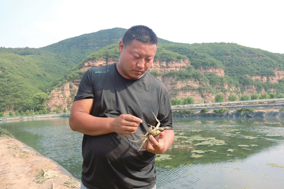 8月19日清晨,太行山間薄霧剛剛褪去,在第一縷陽光的照耀下,左權縣麻田鎮下口村高山冷水蟹養殖基地裡,43個養殖池泛著粼粼波光,增氧機攪動的水聲此起彼伏。養殖合作社負責人趙瑞鵬蹲在池邊,仔細查看著螃蟹的生長情況。幾隻青灰色的螃蟹從他指縫間靈活溜走,迅速鑽入茂密的水草叢中,不見了蹤影。