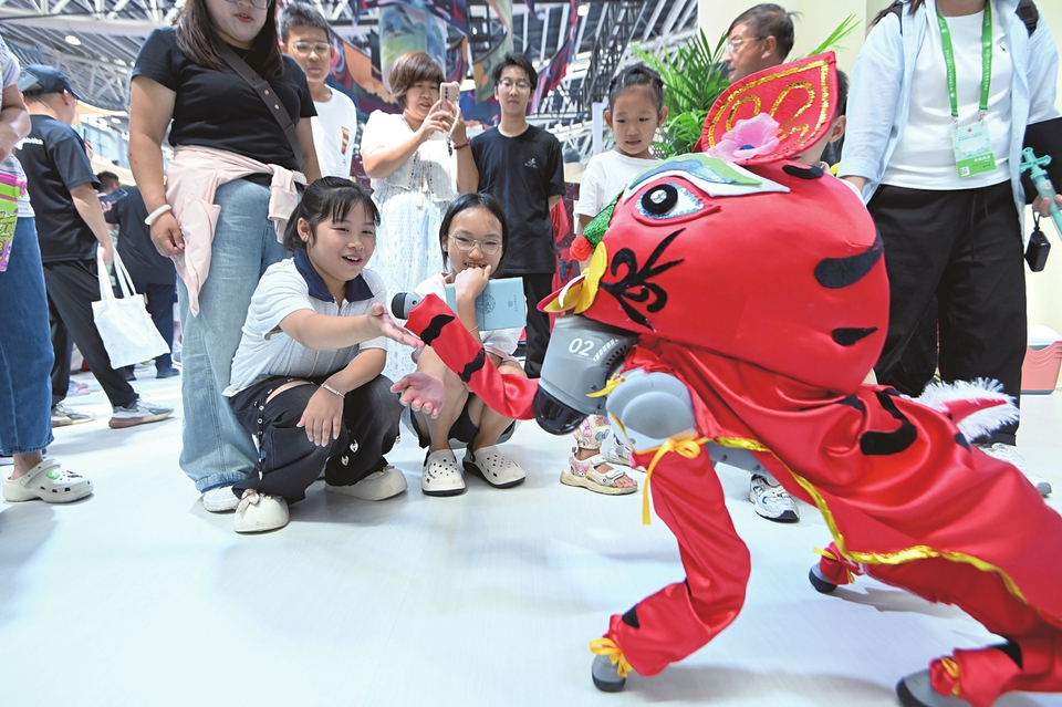 8月21日,長治展區,游客正與黎侯虎裝扮的機器狗互動。本報記者趙夏雨攝