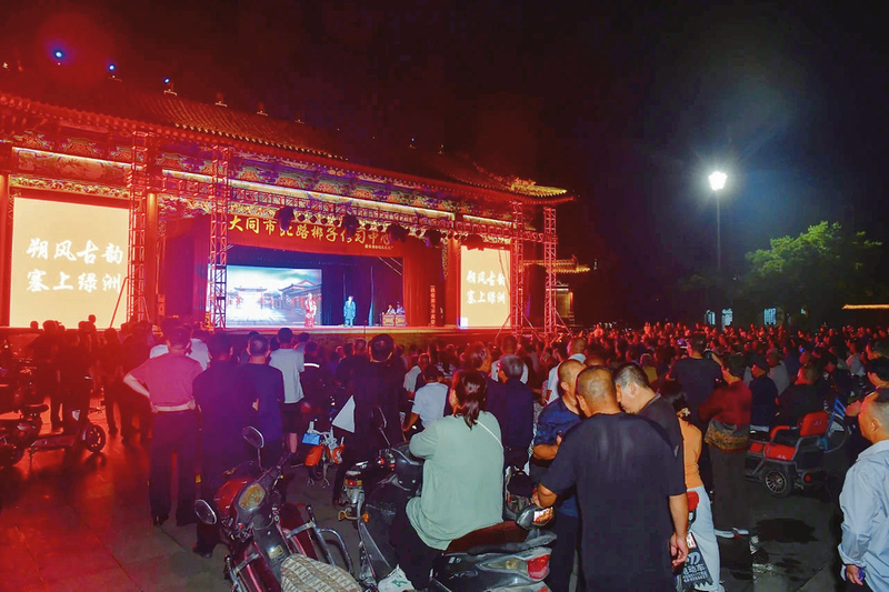 近日,由朔州市委宣傳部、市文化和旅游局聯合朔城區文化和旅游局舉辦的“朔風古韻 塞上綠洲”2025年朔州市消夏群眾文化系列活動之——山西四大梆子優秀劇目展演在崇福寺廣場上演。圖為演出現場。