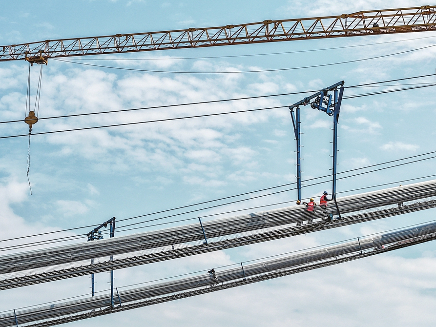 7月30日,在重慶黃桷沱長江大橋建設現場,工人在施工作業(無人機照片)。當日,黃桷沱長江大橋順利完成主纜架設工作,標志著大橋建設即將進入鋼桁梁吊裝工序。黃桷沱長江大橋全長1260米,主跨765米,為單跨懸吊雙塔三跨連續鋼桁梁懸索橋,是國內最大跨徑公軌兩用懸索橋。