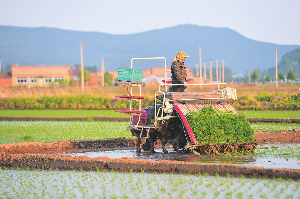 在吉林市永吉縣鑫豐種植農民專業合作社,農民駕駛農機進行水稻插秧。新華社記者張楠攝
