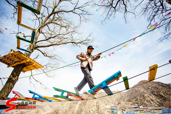 從這些項目陸續開始建設,王付榮就做起了導游的營生。別看他年近花甲,村裡人都夸他有才,說起話來也確實有導游范兒:“我們這裡依山傍水,空氣清新,玻璃棧道、滑草場、網紅橋、還有林中穿越,你想怎麼玩就怎麼玩……”說著說著,王付榮按捺不住示范起了林中穿越的玩法,看著他闖關時動作的協調和嫻熟程度,再聯想他的年齡簡直令人驚訝,不過這定是他接待了一撥兒又一撥兒的游客后慢慢鍛煉和積攢下來的。