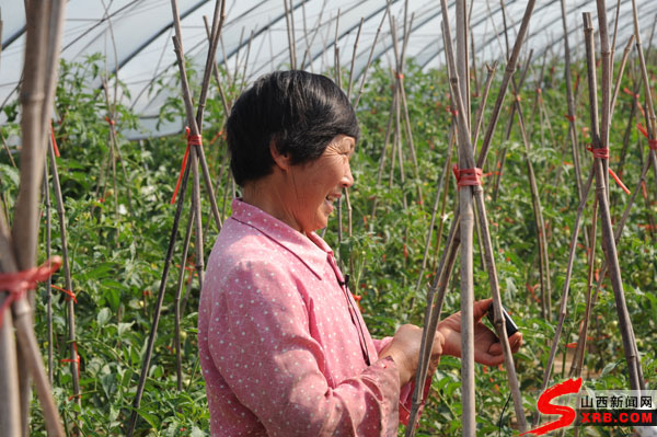 7月7日,壺關縣五龍山鄉劉寨村,58歲的王風仙正在自家的西紅柿大棚裡勞作。雖然還沒成熟,但10個大棚的西紅柿早已被外地客商預定,按現在的行情,一個棚保底收入一萬塊錢。想到這裡,王風仙忍不住嘴角上揚,笑意在臉上綻放。