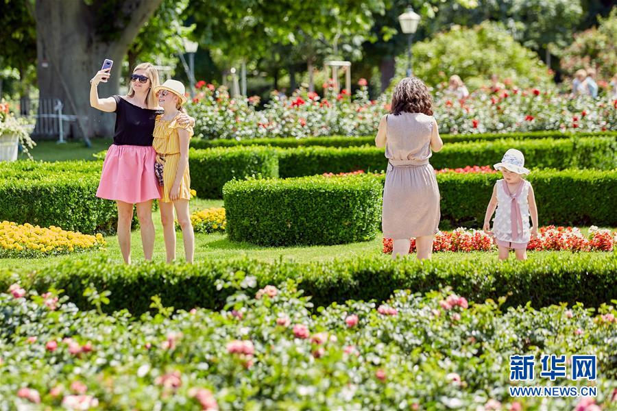 6月27日,在奧地利維也納一處花園,游客自拍留影。 近日,隨著歐盟國家間逐步開放邊境,維也納游客逐漸增多。 新華社發(喬治斯·施耐德 攝)