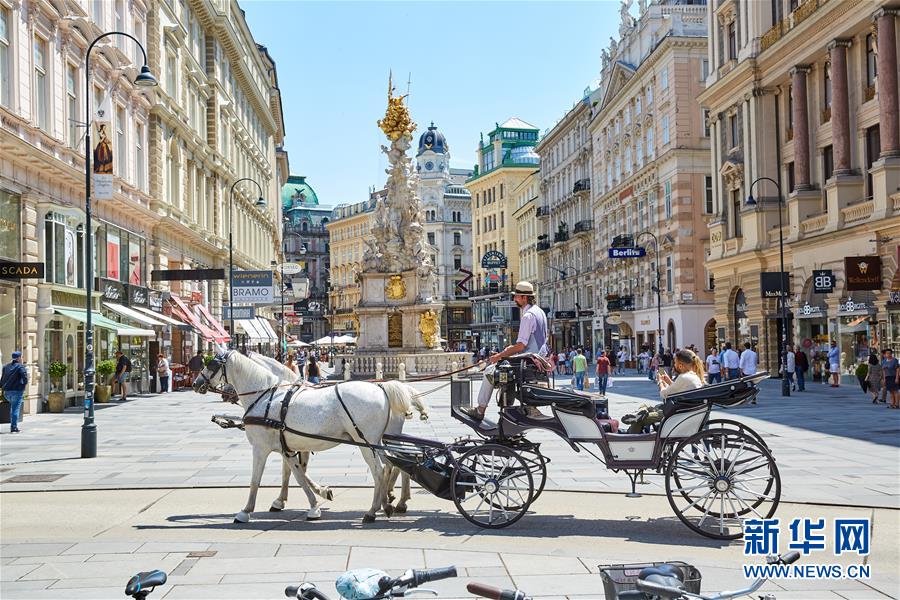 6月27日,在奧地利維也納,游客乘坐馬車游覽內城區。 近日,隨著歐盟國家間逐步開放邊境,維也納游客逐漸增多。 新華社發(喬治斯·施耐德 攝)
