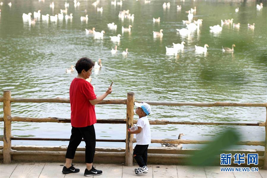 6月27日,一名小朋友在家人的陪伴下在石家庄市動物園天鵝湖邊拍照。 端午小長假期間,人們紛紛帶著孩子走出家門共享假期。 新華社發(許建園 攝)