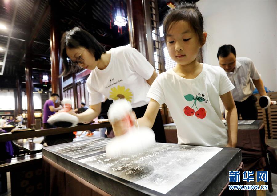 6月27日,一名小朋友在家長的陪伴下在江蘇蘇州碑刻博物館體驗拓碑技藝。 端午小長假期間,人們紛紛帶著孩子走出家門共享假期。 新華社發(杭興微 攝)