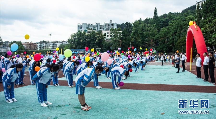 6月27日,烏當中學高三學生向老師鞠躬表達感謝。 當日,貴陽市烏當中學高三學生畢業典禮暨成人儀式在該校校園廣場舉行。 新華社記者 陶亮 攝