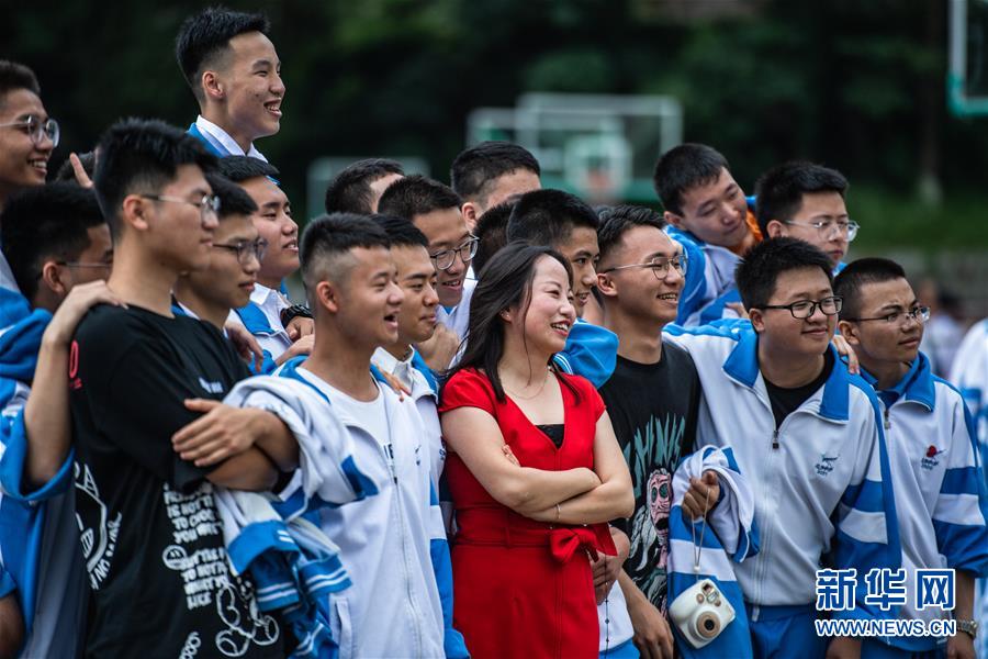 6月27日,同學們和老師合影留念。 當日,貴陽市烏當中學高三學生畢業典禮暨成人儀式在該校校園廣場舉行。 新華社記者 陶亮 攝