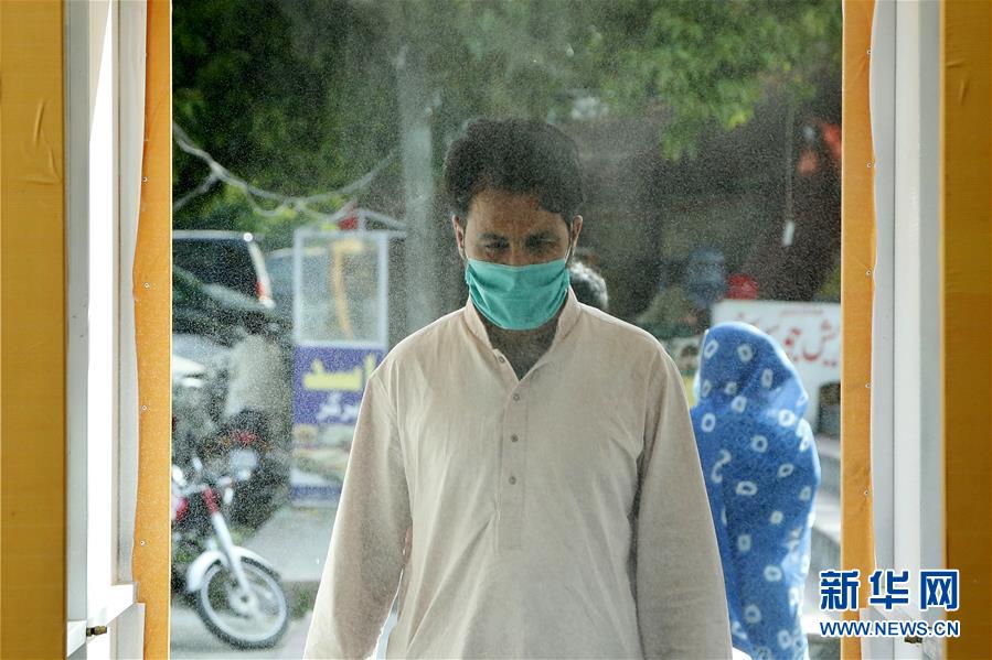 6月27日,在巴基斯坦伊斯蘭堡,一名男子穿過噴洒消毒液的設備。 巴基斯坦衛生部28日上午發布的新冠疫情數據顯示,該國過去24小時新增確診病例4072例,累計確診202955例﹔新增死亡病例83例,累計死亡4118例﹔累計治愈92624例。 新華社發(卡邁勒攝)