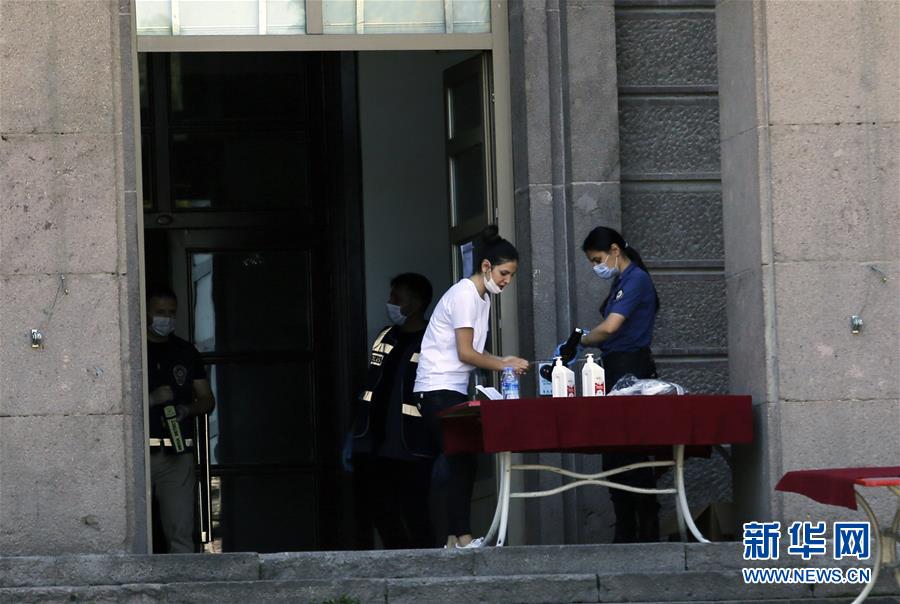 6月27日,一名學生進入土耳其安卡拉的一處考場前給手消毒。