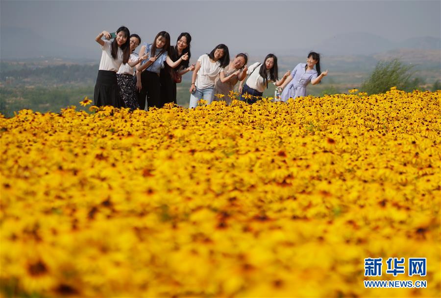 6月27日,游客在內丘縣扁鵲藥谷中藥材種植基地拍照游玩。 近年來,河北省內丘縣依托當地山地丘陵地理優勢,結合市場需求,引導農民發展黑心金光菊、桔梗、黃芩等中藥材種植,打造規模化中藥材種植示范園區,推進農業與鄉村旅游相融合,有效帶動農業增效、農民增收。 新華社記者 朱旭東 攝