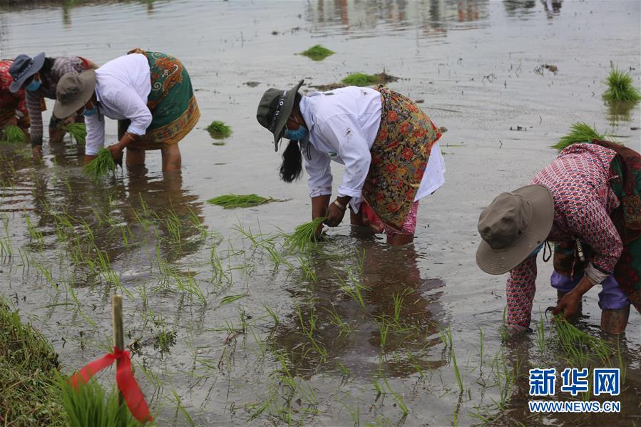 6月29日,幾名尼泊爾婦女在位於加德滿都谷地帕坦的國家農業試驗基地裡插秧。 新華社發(唐薇 攝)