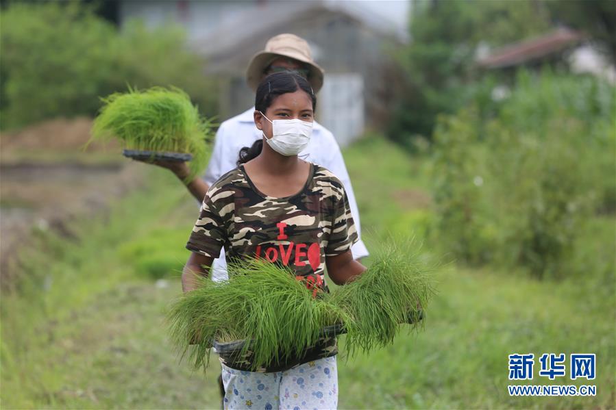6月29日,在尼泊爾加德滿都谷地帕坦,一名女孩將秧苗送往稻田。 新華社發(唐薇 攝)