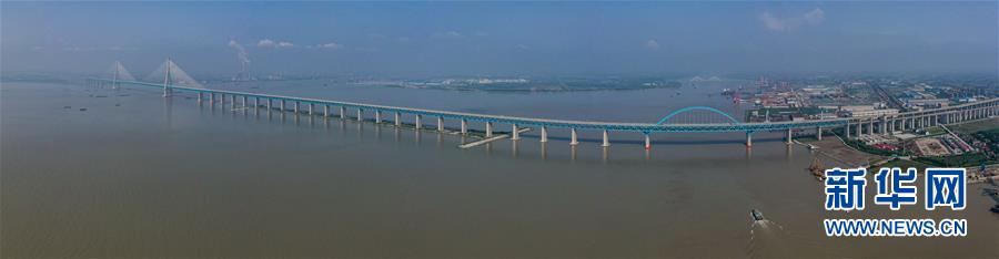 滬蘇通長江公鐵大橋(6月30日攝,無人機全景拼接照片)。 即將於7月1日通車的滬蘇通長江公鐵大橋北起江蘇南通,南至江蘇張家港,公鐵合建跨江正橋全長5827米,為集合高速公路、客貨混線鐵路、高速鐵路的“三合一”過江通道,建成通車后將有效促進長三角城市群跨江融合、協同發展。 新華社記者 李博 攝