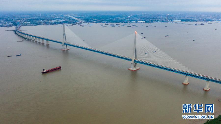 滬蘇通長江公鐵大橋(6月29日攝,無人機照片)。 即將於7月1日通車的滬蘇通長江公鐵大橋北起江蘇南通,南至江蘇張家港,公鐵合建跨江正橋全長5827米,為集合高速公路、客貨混線鐵路、高速鐵路的“三合一”過江通道,建成通車后將有效促進長三角城市群跨江融合、協同發展。 新華社記者 李博 攝