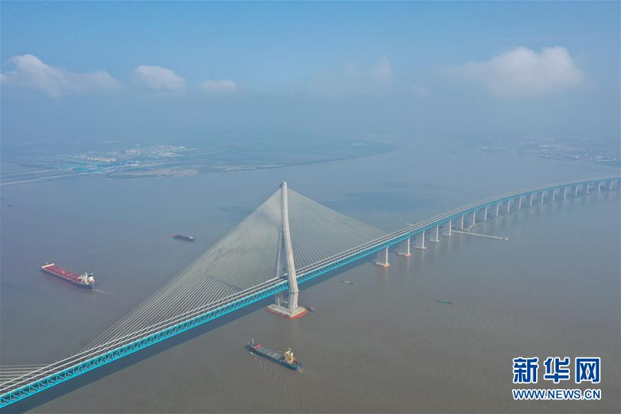 滬蘇通長江公鐵大橋(6月30日攝,無人機照片)。 即將於7月1日通車的滬蘇通長江公鐵大橋北起江蘇南通,南至江蘇張家港,公鐵合建跨江正橋全長5827米,為集合高速公路、客貨混線鐵路、高速鐵路的“三合一”過江通道,建成通車后將有效促進長三角城市群跨江融合、協同發展。 新華社記者 季春鵬 攝