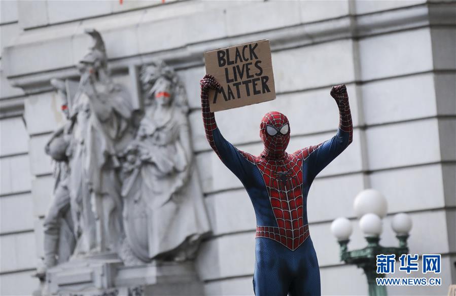 6月30日,一名打扮成“蜘蛛俠”的抗議者在美國紐約市政廳附近手舉寫有“黑人的命也是命”的標語。 由美國明尼蘇達州明尼阿波利斯市非裔男子弗洛伊德遭白人警察暴力執法而死一事引發的各種抗議活動仍在紐約持續進行。 新華社記者 王迎 攝